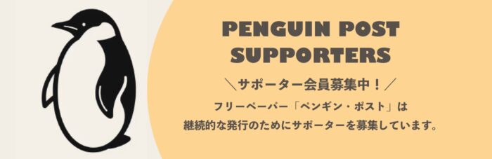 WHAT’S NEW 新着記事 AOAO SAPPORO、記録的⼤雪で足止め受けた空港利⽤者を無料招待!31日までの6⽇間2026.01.27喫茶ペンギンが正和堂書店と初コラボ!ブックカバーと栞が阪神梅田本店に登場2026.01.26企画展「ペンギン展 海の健康を教えてくれるいきもの」丸の内で開催!小学生向けイベントも2026.01.25ペンギン来日111周年を記念!東京都立中央図書館で企画展示が3月から開催2026.01.22ペンギンのライブ配信も!小諸市動物園が開園100周年に向けて2026年春にリニューアルオープン2026.01.18一羽のペンギンが人生を諦めた男の人生を変える!映画『ペンギン・レッスン』12月5日より全国公開2025.11.27 最新記事を一覧を見る LATEST ISSUE フリーペーパーの最新号 特集 こんなところにペンギン!世界でも類を見ないほどの「ペンギン大国」として知られる日本。その数は、世界中の飼育されているペンギンの4分の1を占めるともいわれます。そんな日本にあっては、ペンギンが暮らしている場所も、実にたくさん。その特色もさまざまだ。いつもとちがうところで暮らすペンギンと出会うことが、新たな発見をもたらしてくれるかも。 詳細はこちら